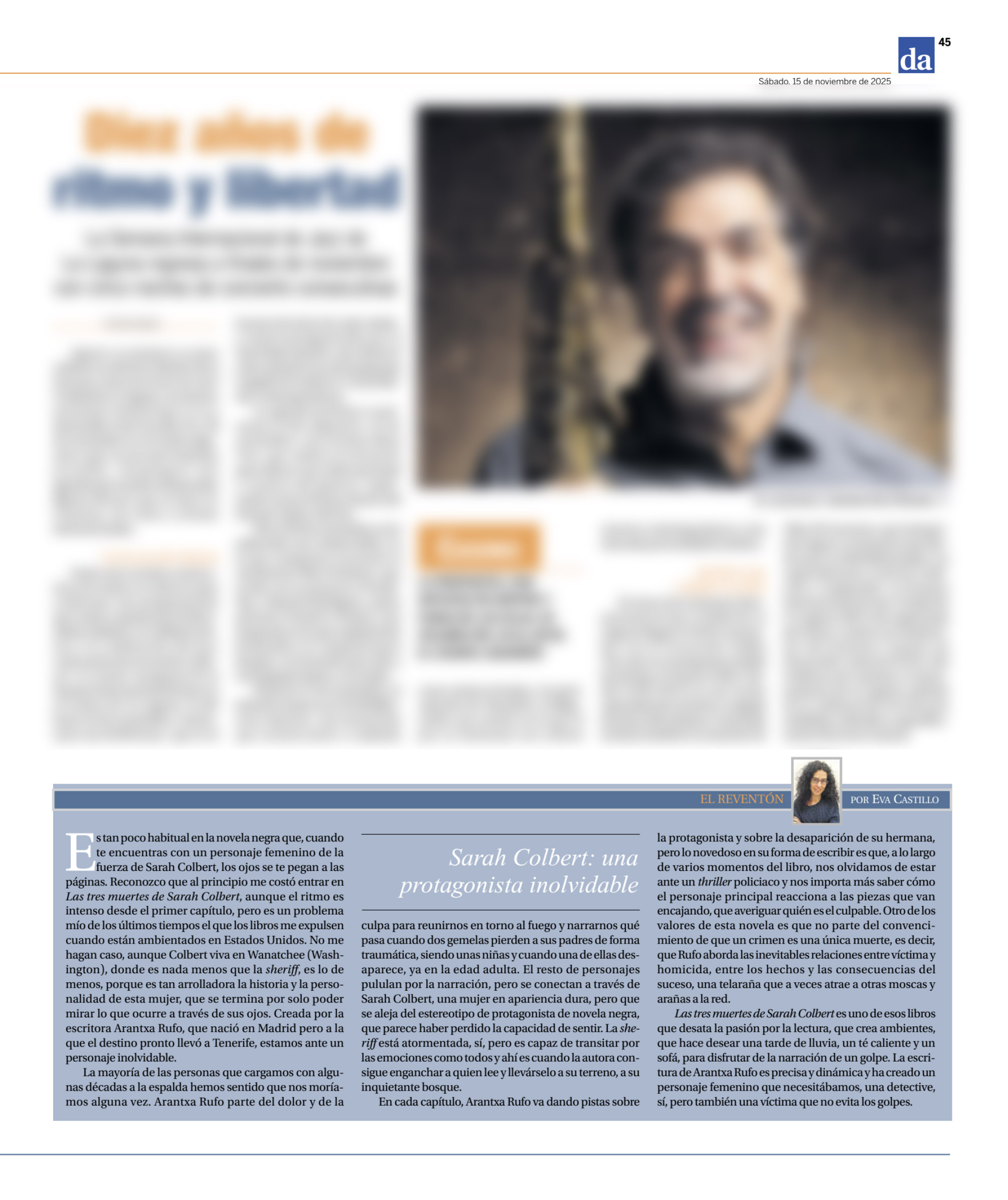 Una lectura muy recomendable, sin tiempo para tomar aliento gracias al estilo adictivo que dibuja Arantxa Rufo en Las tres muertes de Sarah Colbert, y que sacude y recompone cada renglón de la narración para generar atmósferas reales que respiran vida y tormento a manos llenas.